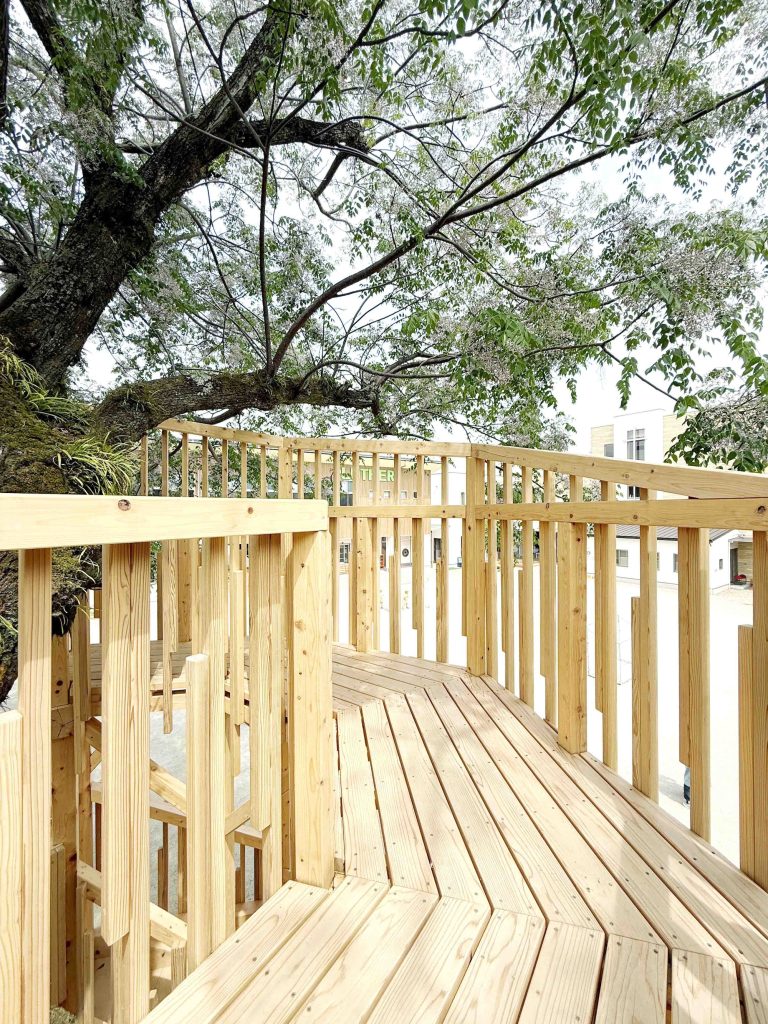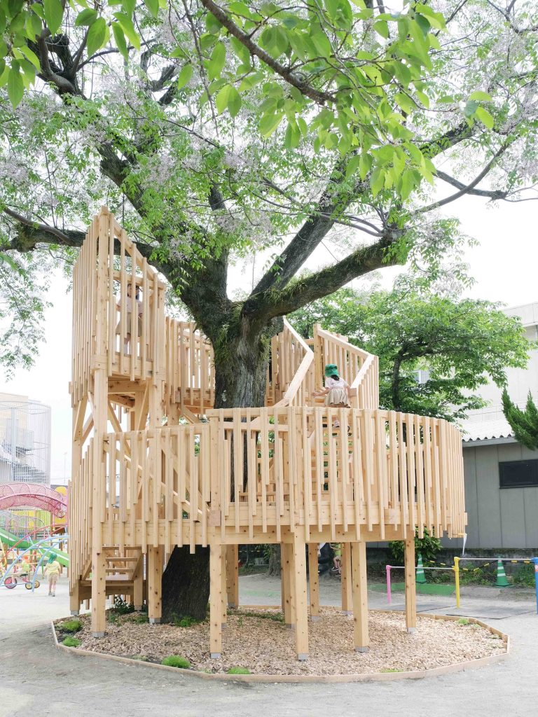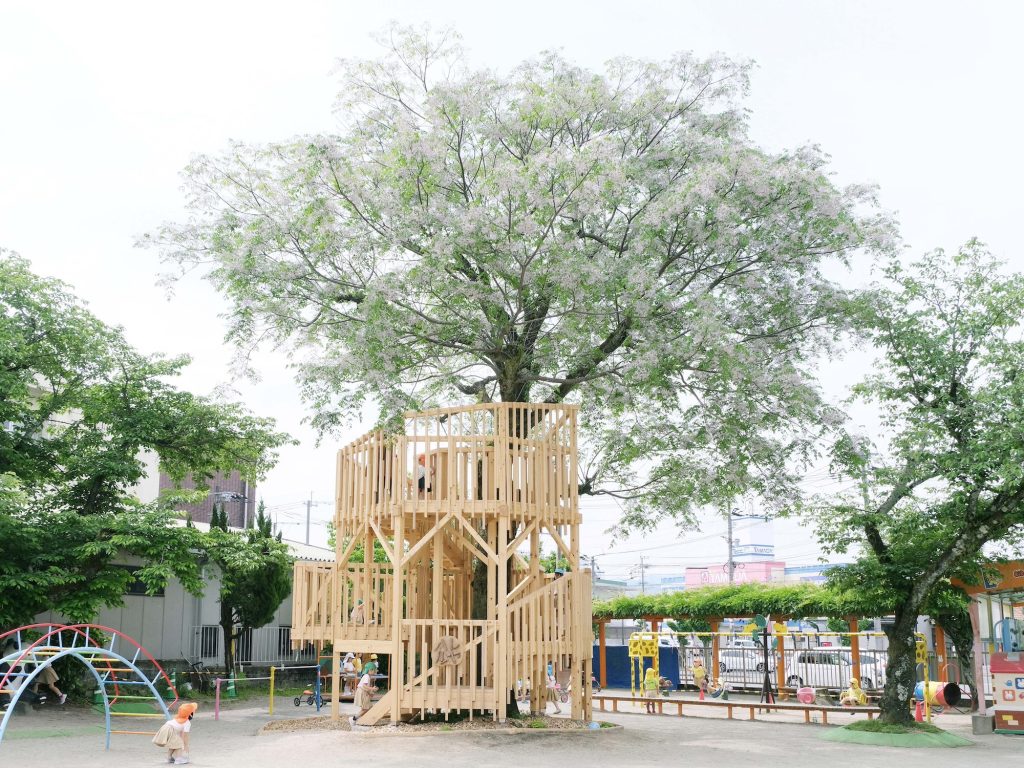 中央センダンの葉の傘、木陰の下は夏でも遊べる