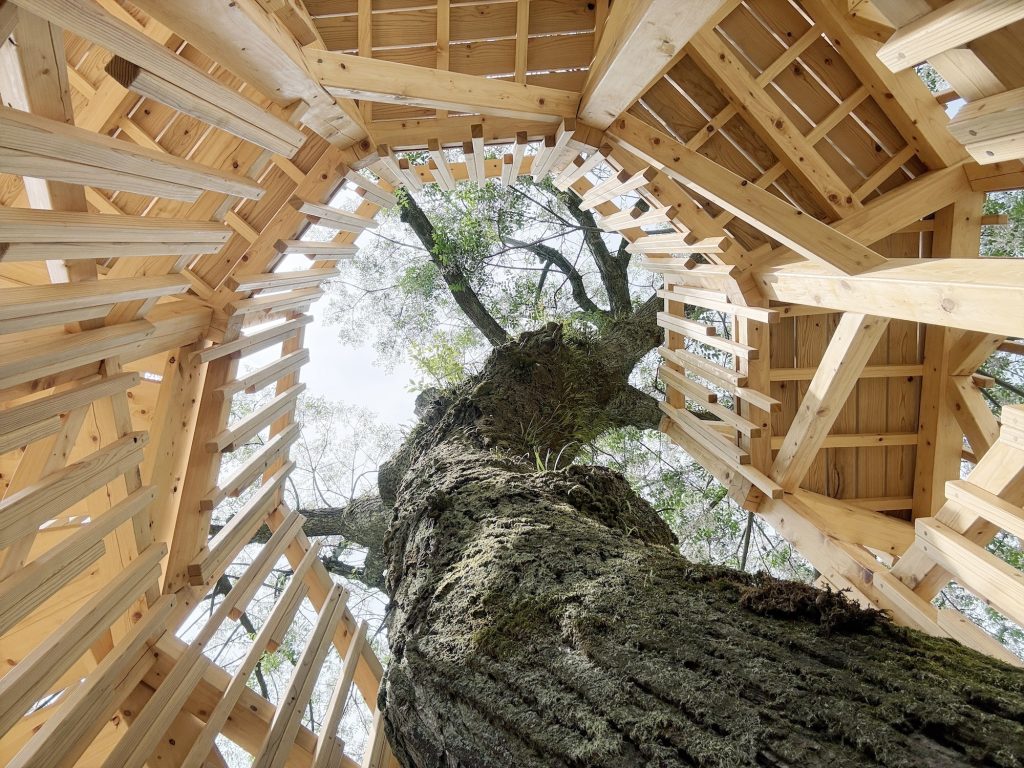 桧のチップが敷き詰められた根元から見上げたら ねじれた樹形が見れる